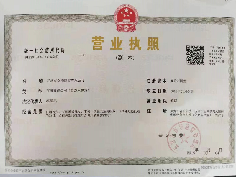 黑龍江省眾峰農(nóng)業(yè)科技有限公司 本公司成立于2008年九月12號(hào),2018年1月4號(hào)改為五常市眾峰商貿(mào)有限公司,本公司主要以有害生物防治研發(fā)為主業(yè),主要針對(duì)客戶(hù),中儲(chǔ)糧企業(yè),中糧企業(yè),養(yǎng)殖場(chǎng),牧場(chǎng),等各大企業(yè)滅鼠簽約合作!為了廣大各地客戶(hù)滅鼠需求,本公司特為農(nóng)業(yè)企業(yè)打造多只勤奮專(zhuān)業(yè)的滅鼠團(tuán)隊(duì)上門(mén)服務(wù),其服務(wù)地區(qū)為,黑龍江省各大糧庫(kù),米業(yè)養(yǎng)殖場(chǎng)等各大企業(yè),多年來(lái)公司加盟商遍布,吉林省,遼寧省,山東省,山海關(guān)等地,公司服務(wù)業(yè)績(jī),糧庫(kù)七十多家,米業(yè)五百多家,養(yǎng)殖場(chǎng)二百多家,各大超市四十多家,各小產(chǎn)業(yè)無(wú)數(shù)!產(chǎn)品每三個(gè)月階段改進(jìn)創(chuàng)新,獨(dú)家配方,超強(qiáng)引誘劑讓老鼠永不拒餌!勤奮的團(tuán)隊(duì),專(zhuān)業(yè)的技術(shù)讓所有企業(yè)告別鼠害煩惱!